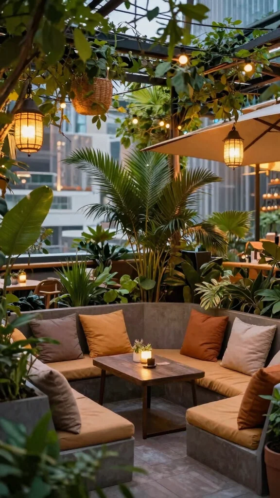 What Are Practical Cozy Decor Tips for Lighting Textiles and Greenery on a Rooftop Cafe?