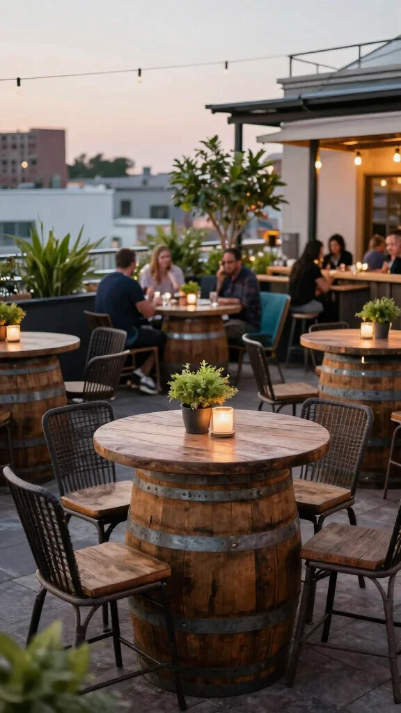 Using rustic barrels as tables introduces a unique charm to your rooftop cafe. These versatile pieces can be repurposed as high-top tables or side tables, providing both character and functionality. Pair them with stools or benches to create a casual yet stylish seating area that invites relaxation and conversation.