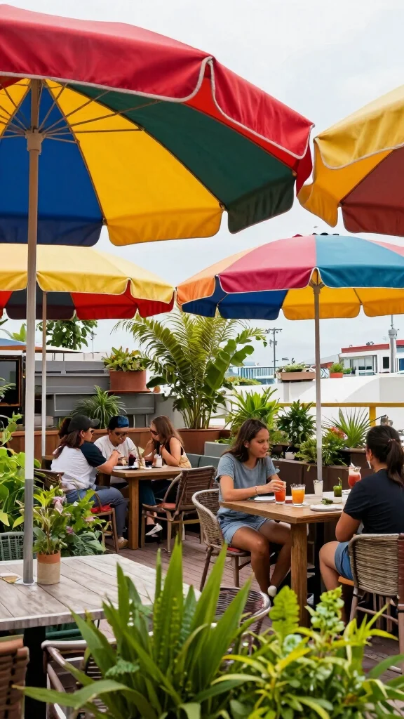 Colorful umbrellas can create a lively, cheerful atmosphere, encouraging guests to enjoy their time at your rooftop cafe.
