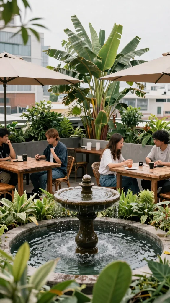 Creating an ambient soundscape is a unique aspect of cafe decor that is often overlooked. Soft background music, the gentle sound of water features, or even the chirping of birds can significantly enhance the vibe of your rooftop space. Consider incorporating a small fountain or water feature to add tranquility and freshness, creating a multi-sensory experience for your patrons.