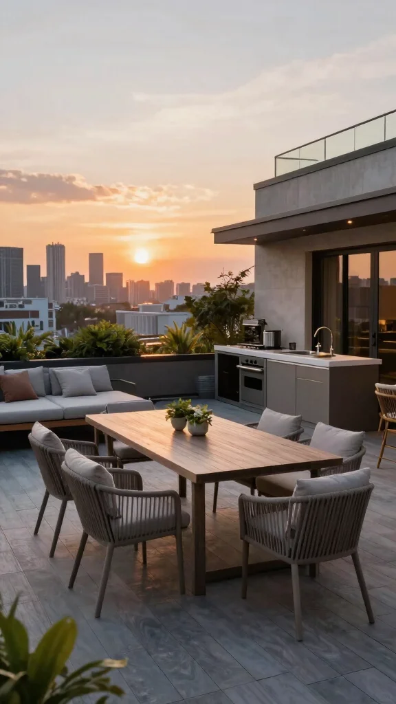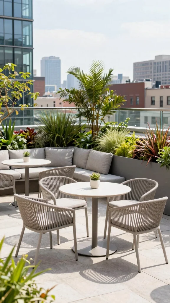 Use modular furniture that can be rearranged for different occasions, a neutral color palette, and textured greenery to add depth. Prioritize safety with non-slip flooring, sturdy railings, and proper drainage. Add smart lighting and weatherproof fabrics to keep the space inviting, while a few statement plants anchor the urban garden inspiration.