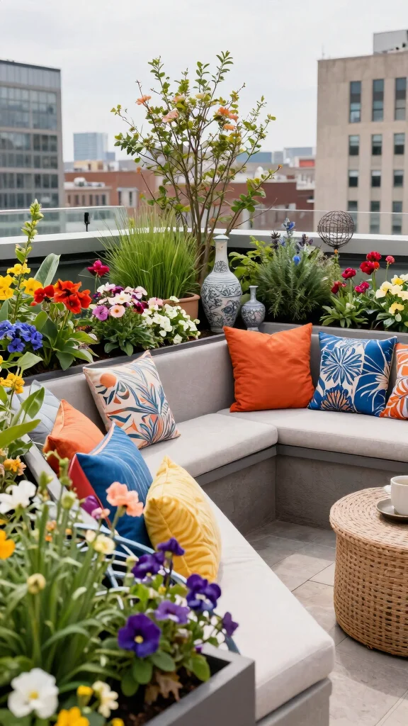 Vertical gardens are a brilliant way to bring greenery to compact rooftops. They allow you to maximize your plant display without taking up valuable floor space. By using wall planters or trellises, you can create an eye-catching vertical arrangement that draws the eye upward, adding depth and charm. Mixing flowering plants with trailing vines creates a dynamic and lush visual experience that brightens any space.