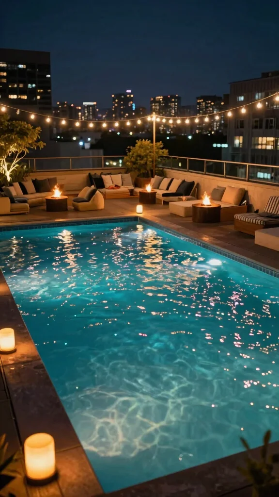 Elevate your rooftop pool experience with designs that shine after sunset. Focus on creating a magical nighttime ambiance through strategic lighting and cozy features. Picture LED lights that change colors in the pool, or floating candles that add a romantic touch.