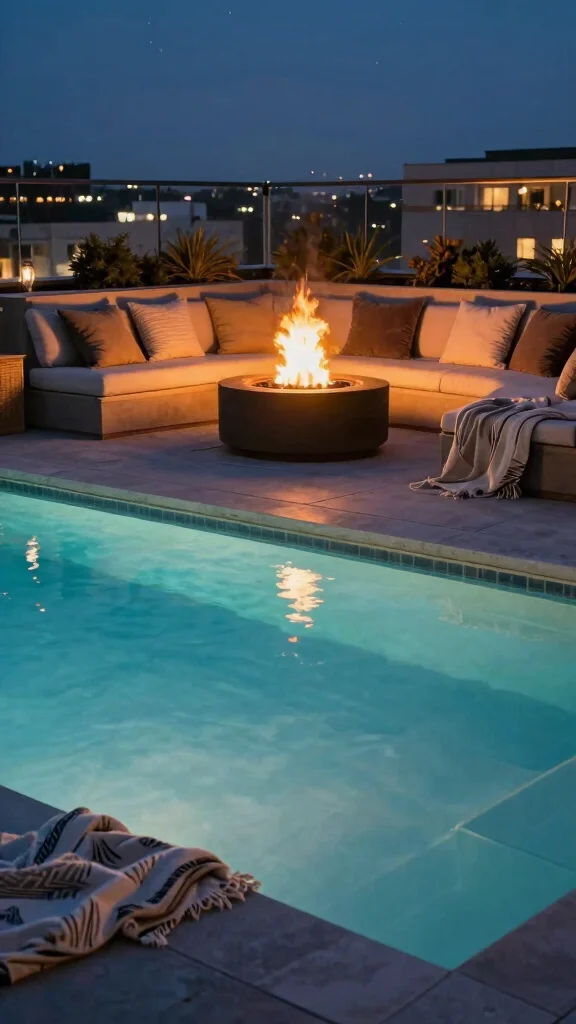 Turn your rooftop pool design ideas into a cozy nightly retreat: place a fire pit by the water, add snug blankets, and curate seating for warm gatherings. A sleek fire pit and mindful styling extend pool seasons and elevate the entire experience.