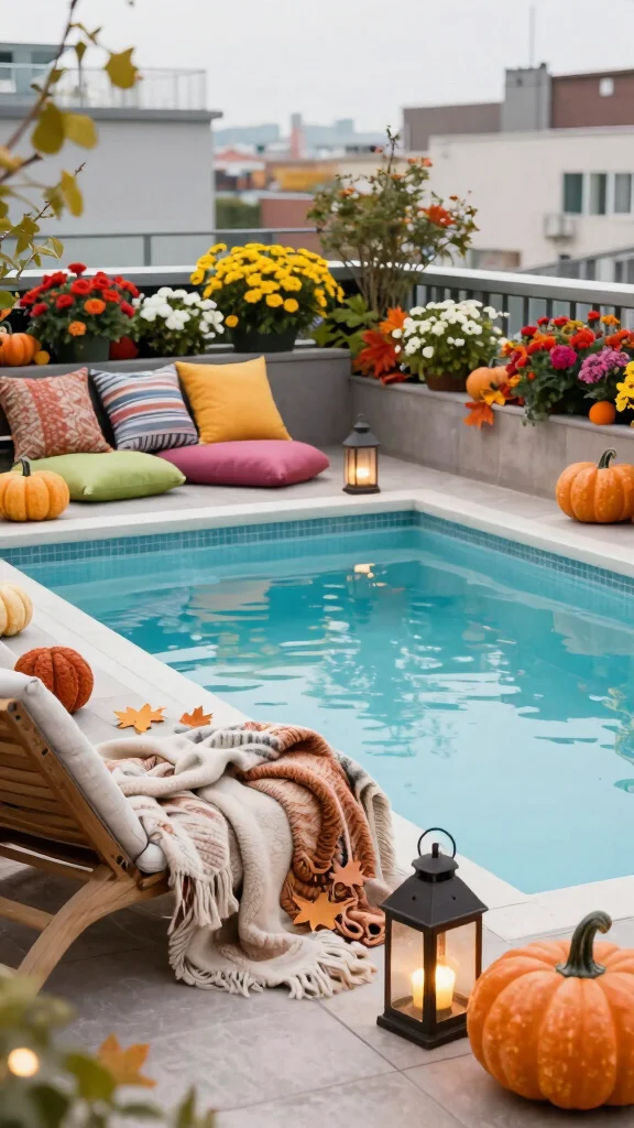 Bring seasonal charm to your rooftop pool with decor that evolves throughout the year. This approach adds freshness and excitement to your outdoor space, encouraging use of the pool all year round. In winter, consider cozy blankets, lanterns, and evergreen arrangements for a festive feel.