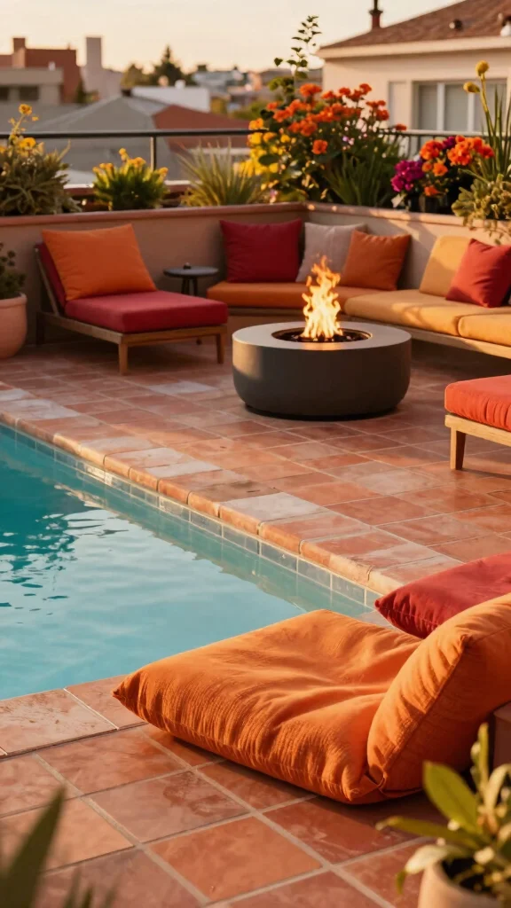 Introduce warmth to your rooftop pool area by utilizing a warm color palette that creates a cozy atmosphere. Think terracotta, soft oranges, and deep reds that invite relaxation and comfort. Incorporate textured fabrics for poolside furniture, like cushions and throws that reflect these warm hues. A fire pit can enhance this cozy vibe, perfect for cooler nights spent outdoors.