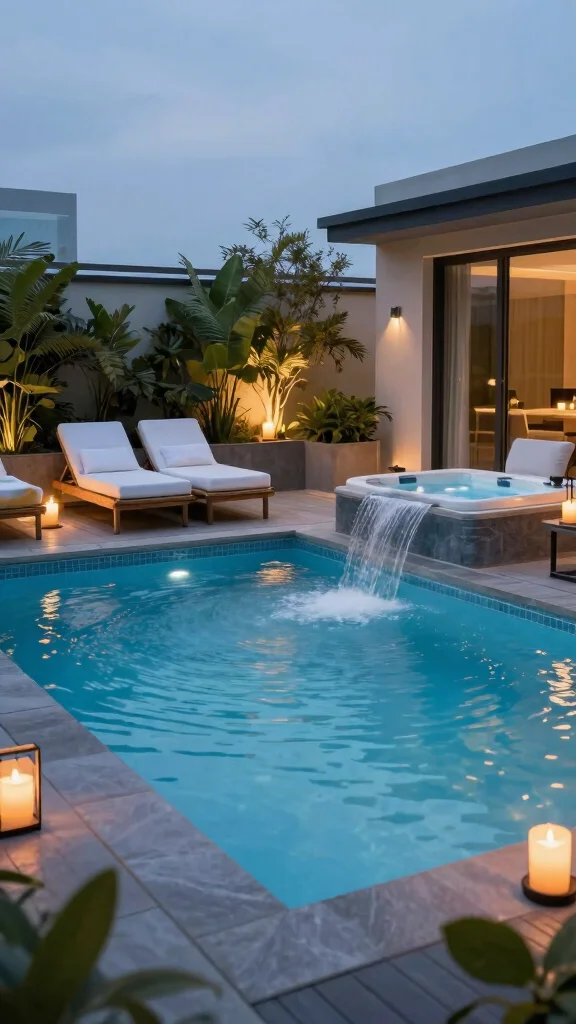 Think beyond a simple pool: add a spillover spa, cantilevered decking, floating steps, or an infinity edge illusion. Incorporate programmable lighting, automated climate control, and discreet water features like jets or fountains. Use planters and privacy walls to frame the skyline, and choose seamless transitions between pool and lounge zones for luxury pool designs and urban oasis ideas.