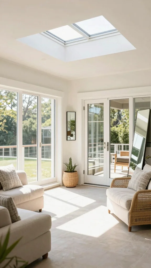 To enhance this light-filled space, choose large sliding glass doors that offer easy access and beautiful views. Light, reflective colors in furniture and decor further elevate brightness and warmth. This design resonates with the trend of creating uplifting spaces that enhance mood and well-being.
