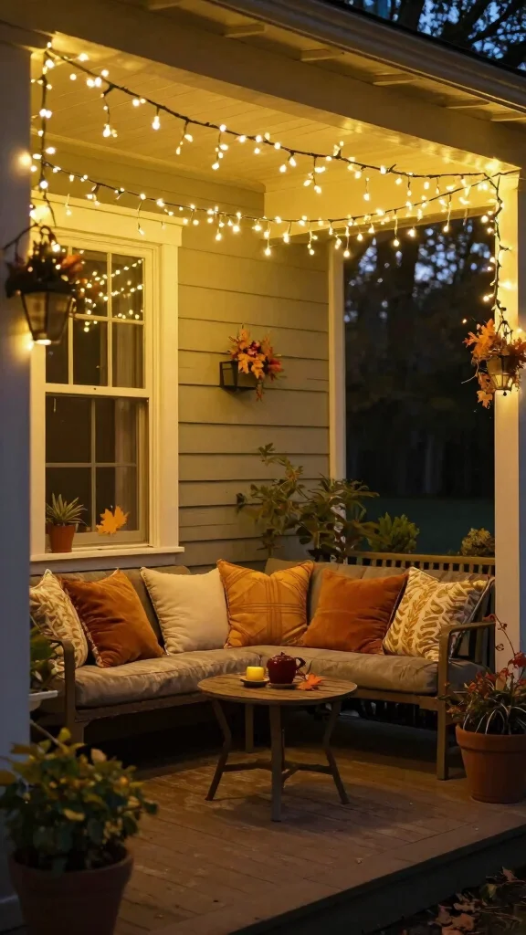 Transform your porch into a magical evening retreat with the soft glow of fairy lights. Drape them along the ceiling, doorframe, or around your seating area to create a twinkling effect that enhances the cozy fall atmosphere. Opt for warm white or amber lights to maintain that inviting feel, and consider pairing them with natural elements like branches for a rustic touch.