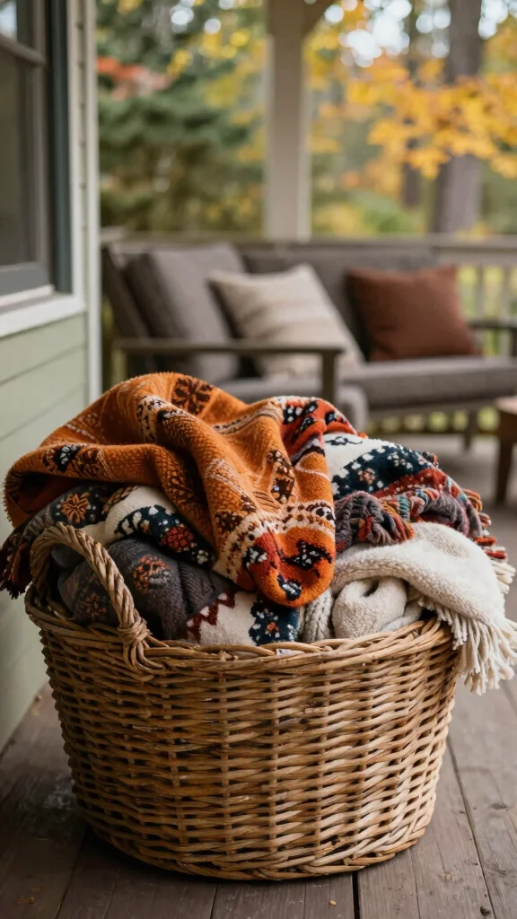 An outdoor blanket basket invites warmth and comfort during chilly fall evenings. Select a decorative basket and fill it with cozy throws in warm colors and rich textures. Place the basket near your seating area for easy access, making it both functional and decorative. Choose fabrics that can withstand the elements if left outside for extended periods.
