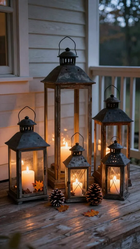 Lanterns bring a warm and inviting glow to your porch, especially as the days grow shorter in fall. Opt for lanterns in earthy tones or wooden finishes that complement your rustic style. Fill them with candles, fairy lights, or seasonal decor items like pinecones and leaves to create a charming effect. Group several lanterns of varying sizes along your steps or on a side table to draw the eye and create visual interest. For an extra touch, consider a larger lantern as a centerpiece surrounded by smaller ones.