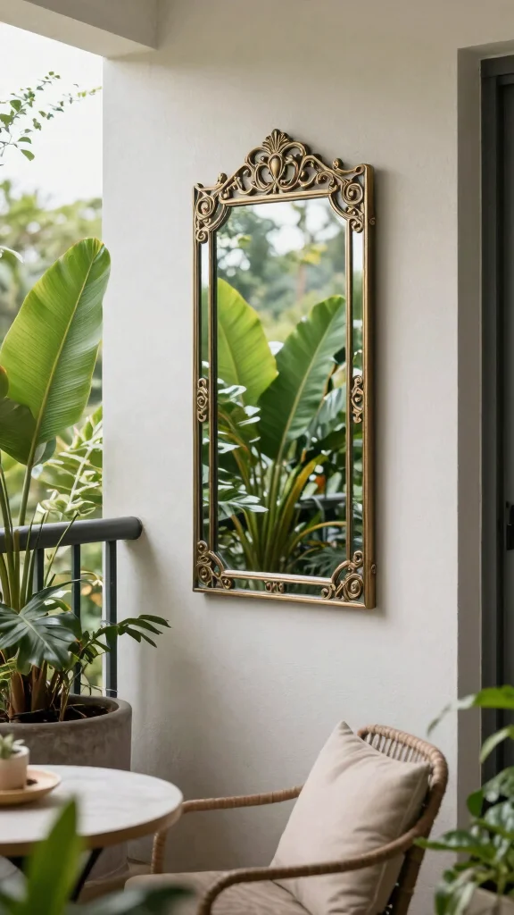 Select a decorative mirror that complements your balcony’s style and place it strategically to maximize its impact. Combine it with plants to soften the edges and enhance the natural ambiance.