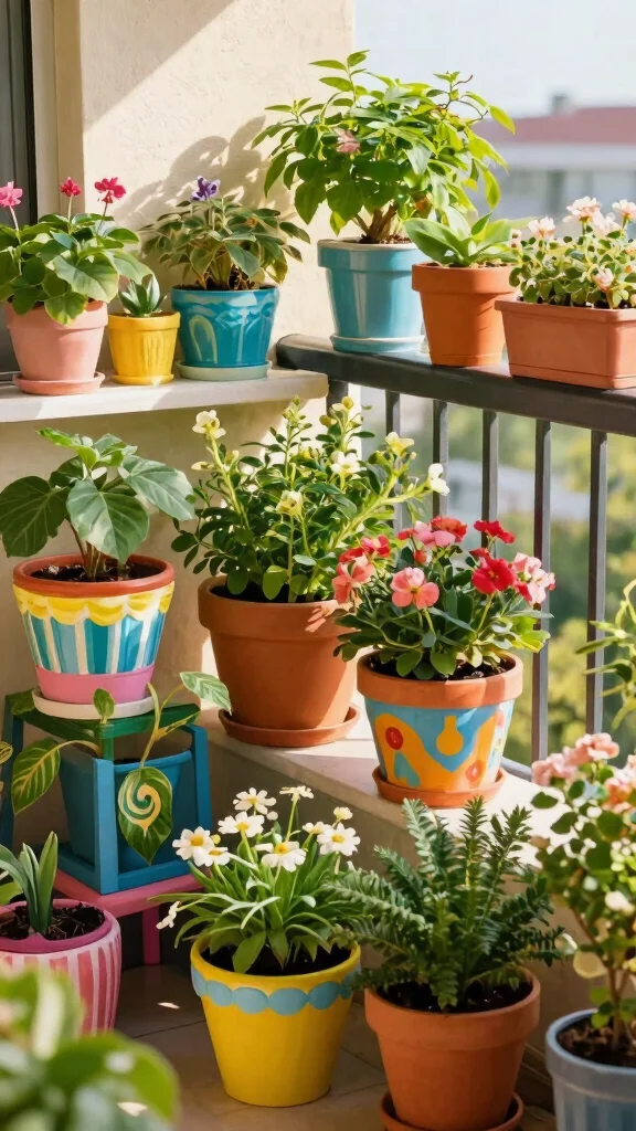 Group different containers together for a fun and eclectic vibe, or opt for a uniform style to create a more sophisticated look. This colorful arrangement will enhance the overall aesthetic of your balcony and uplift your mood whenever you step outside.