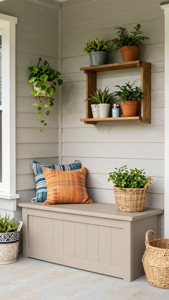 Functional seating enhances the comfort of your porch while maintaining a stylish and organized look.