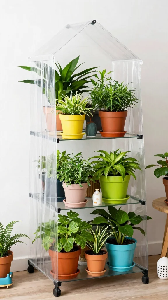 A tiered plant stand serves as a creative greenhouse solution! This innovative design allows you to cultivate numerous plants in a small footprint while also creating an attractive display. Utilize a ladder-style stand, adding plastic sheeting to the back and sides to create a sheltered environment for your plants. This way, they receive sunlight while being protected from harsh weather conditions.