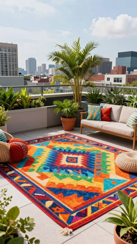 Add a touch of comfort to your rooftop terrace with outdoor rugs that bring color and warmth to the space. These rugs can define areas, helping to create distinct zones for dining, lounging, or gardening. Imagine a vibrant patterned rug anchoring your seating area, inviting you to relax and enjoy the outdoors.