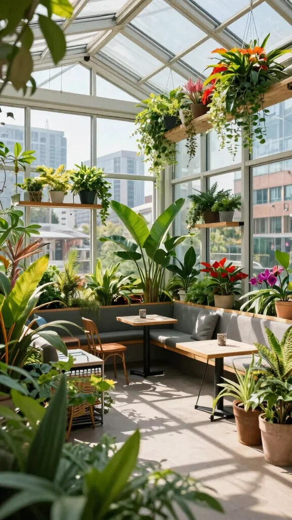This greenhouse vibe can be achieved easily with shelves to showcase smaller plants and hanging planters that add vertical interest. A cozy seating area invites you to unwind amidst the greenery, making it a perfect escape from the urban hustle.