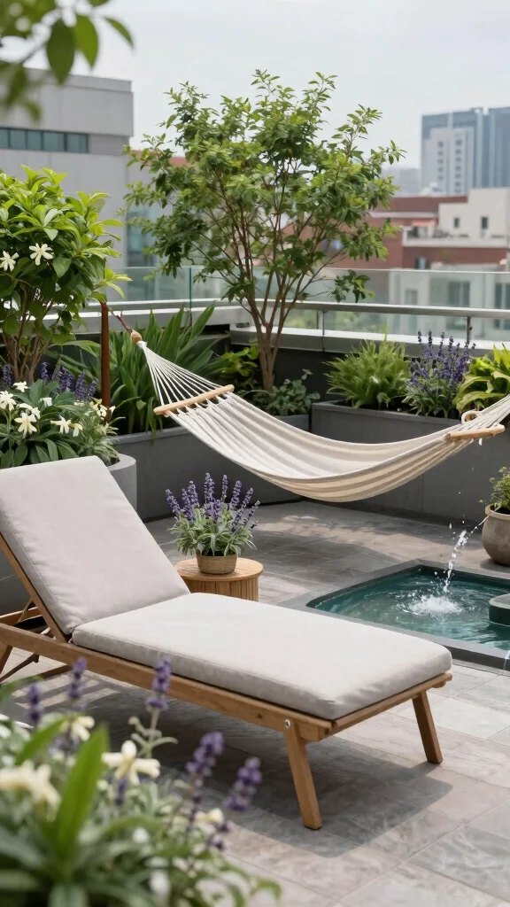 In terrace garden design rooftop ideas, a small wellness corner with a water feature can reduce perceived stress by up to 30%. Add a comfy lounge and yoga mat, and transform your terrace into a practical, calming retreat.