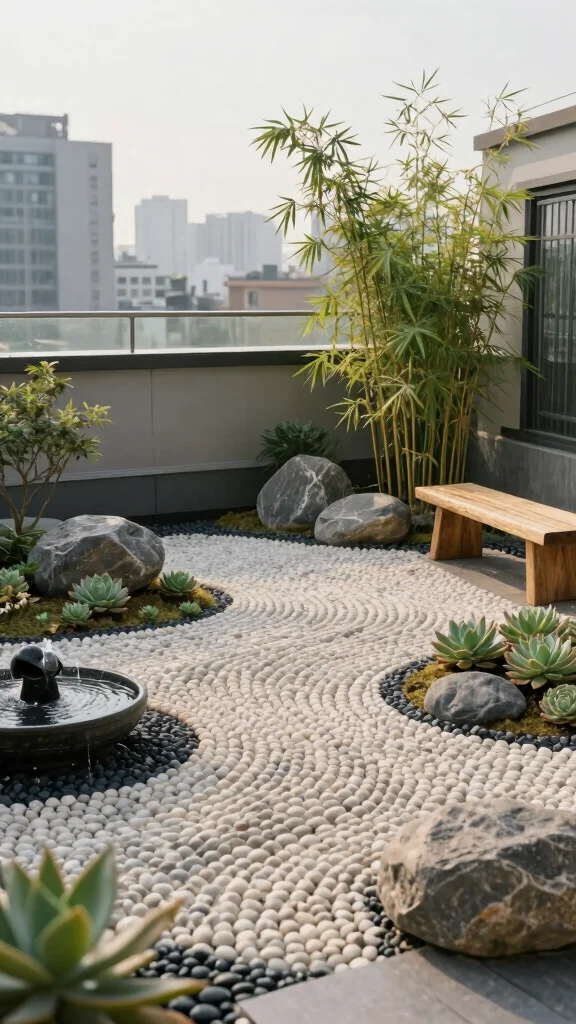 Incorporate bamboo, succulents, and low-maintenance plants for a clean, soothing aesthetic. Seating should be strategically placed to promote contemplation and peace.