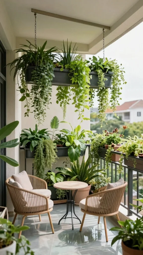 Incorporating overhead planters can breathe new life into your balcony, transforming it into a vibrant garden oasis just steps from your door.