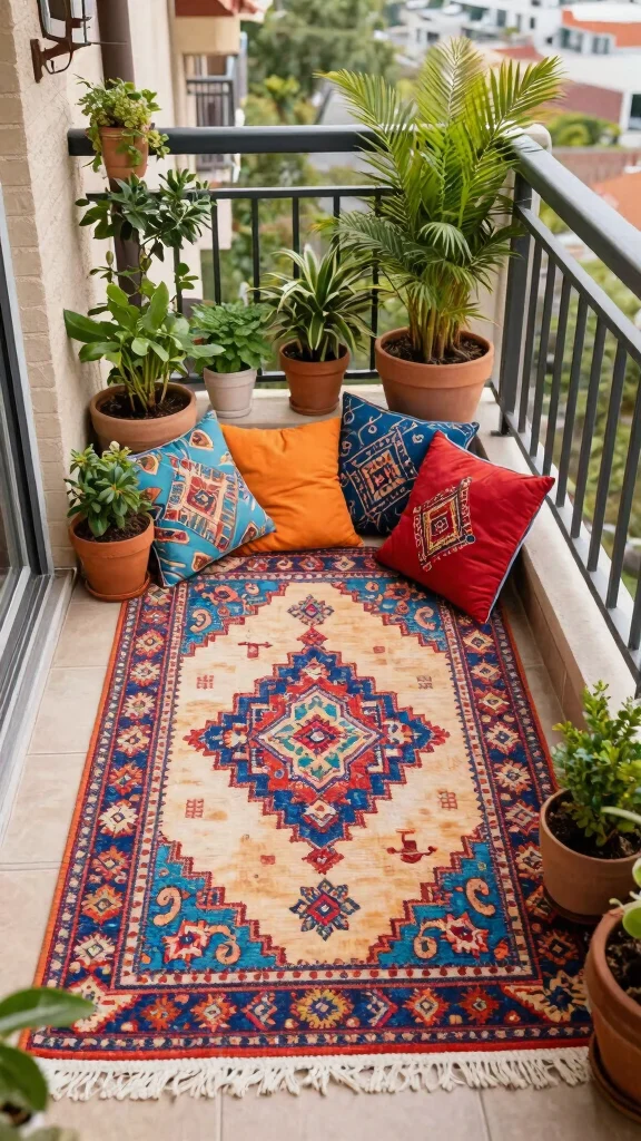 A rug can bring color and texture to your balcony, tying together your furnishings and plants beautifully. Look for patterns or colors that resonate with your style, creating a cohesive outdoor living area.